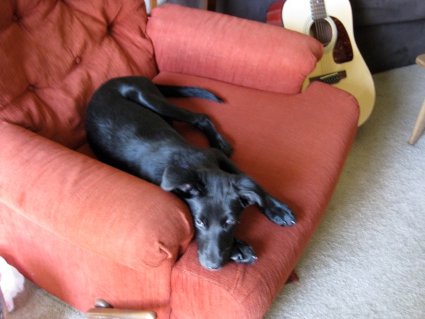 I’ve had Oreo now for about five weeks, and in that brief span she’s grown tremendously, both physically and mentally. She knows a couple of basic commands and has learned to tell me when she needs to go outside. Before I got her, I made the decision to not let her on my couch. My recliner, however, is a different story, because it’s old and, frankly, a P.O.S., so I don’t mind if she sits on it (I bought it from one of my college roommates for $10). So, a handful of times over these past five weeks I’ve scooped her up and had her lie in my lap while I watch TV. Late this morning, to my pleasant surprise, I found her asleep in the recliner while I was working in my office.
