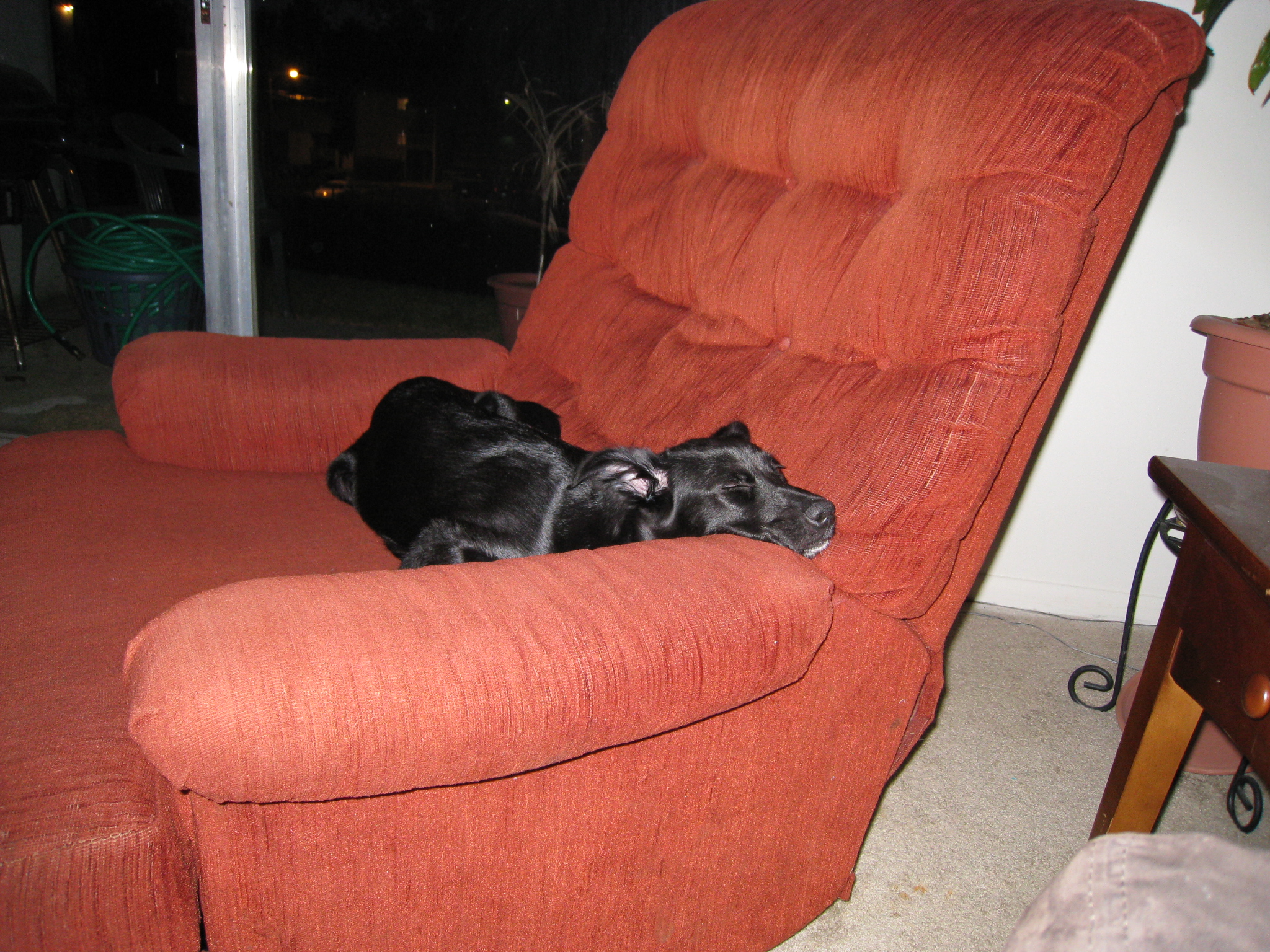 I’ve had Oreo now for about five weeks, and in that brief span she’s grown tremendously, both physically and mentally. She knows a couple of basic commands and has learned to tell me when she needs to go outside. Before I got her, I made the decision to not let her on my couch. My recliner, however, is a different story, because it’s old and, frankly, a P.O.S., so I don’t mind if she sits on it (I bought it from one of my college roommates for $10). So, a handful of times over these past five weeks I’ve scooped her up and had her lie in my lap while I watch TV. Late this morning, to my pleasant surprise, I found her asleep in the recliner while I was working in my office.